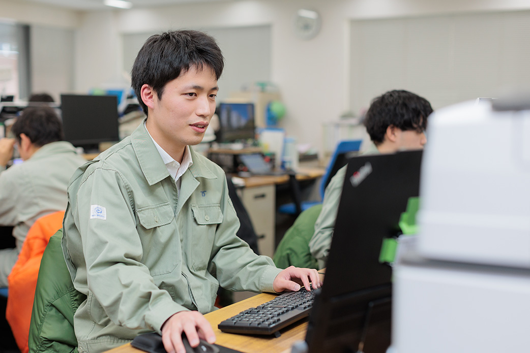 ごみ処理が滞らないように各施設の順調な運転を管理するのが役目。市民生活の快適さやまちの美化を維持するために不可欠な仕事だと、責任を持って取り組んでいます。今後は設計図面を一目見て迅速に指示を出す先輩方の仕事ぶりを目標に努力したいです。そのためには現場を知ることも大切。施設へ積極的に足を運んで経験値を高め、職場仲間から頼りにされる存在を目指します。