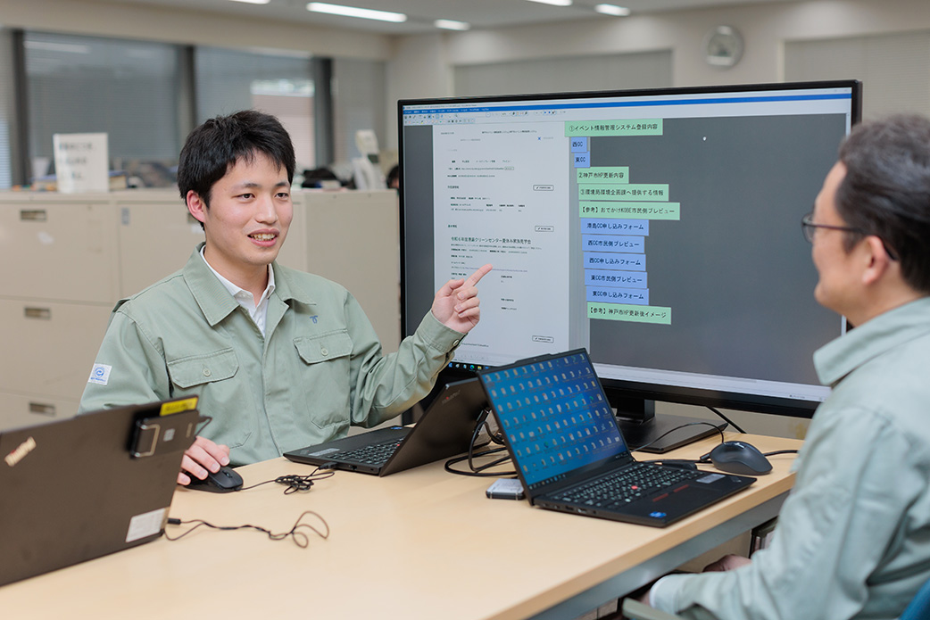 神戸市内にあるクリーンセンターや埋立処分地の保全管理、設備改修時の工事設計などに従事しています。24時間365日休みなく稼働するクリーンセンターは焼却炉をはじめ各種設備の劣化が早く、建設から20〜30年ほど経っている施設もあるため、安全で効率的な運転を行うには、こまめなメンテナンスが欠かせません。連携する他部署と情報共有や意見交換を緊密に行い、スムーズな計画の推進を心がけています。